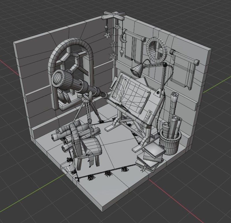 I modeled all the objects and scenery in Blender. I used standard modeling tools and kept checking the model in orthographic camera mode to convey the isometric illustration as closely as possible. It was a test and a good exercise in creating precise object proportions. To keep the proportions, I first created the walls and the largest objects (windows, a table, a chair, and a telescope), then measured the size and the position of the other objects.