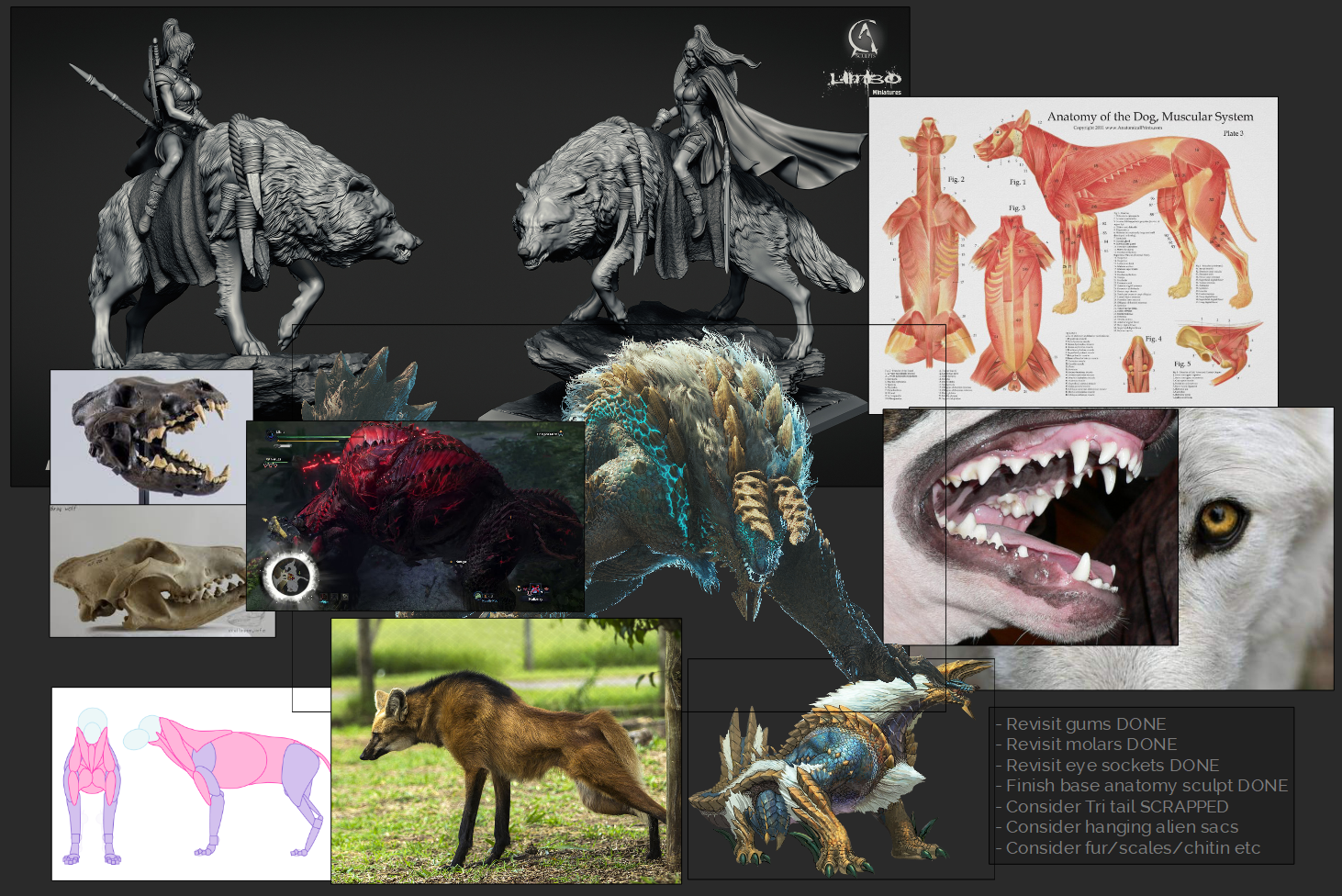 Below you can see one of my reference boards that displays two monsters from the game as well as anatomy references of real word canines and wolves.