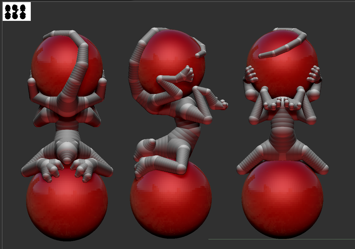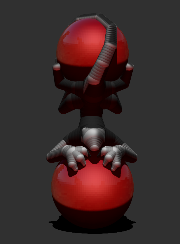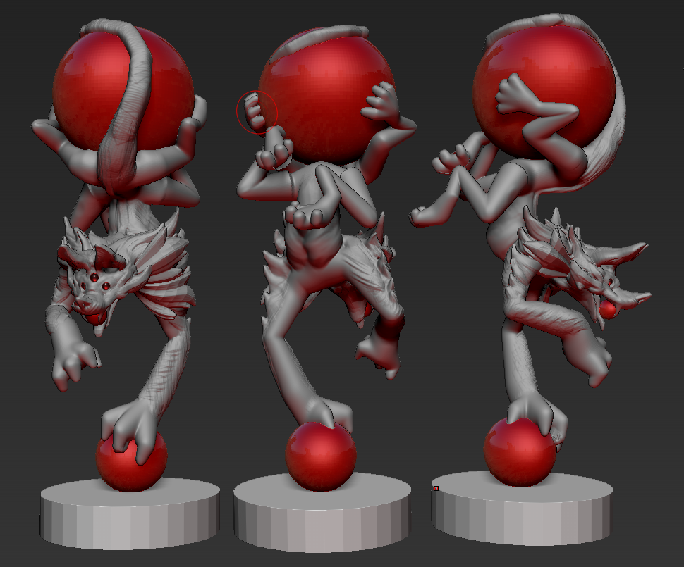 Using ZSpheres, I focused only on trying to create a pose that would allow a shadow to be cast over the body with the light revealing the head. Design-wise I was coming from the angle of the stereotypical tamed Lion. Beyond that, I only added 2 alien-esque features: a long tail to wrap around the ball, and a third pair of limbs which I thought would help sell the balancing act.