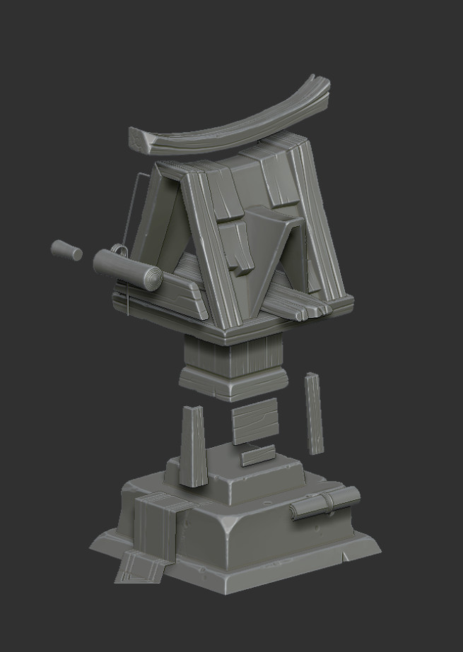 This was pretty straightforward process for me, nothing special here just stylized zBrush sculpting. I am using standard brushes + free Orb’s brushes (really recommend them). Also I made a little custom alpha for Standard (DragRect) brush to help me in making owl’s feathers. Model was exploded into parts just to guarantee independent and clean baking process: