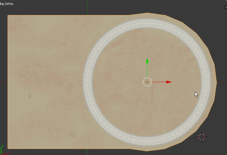 However, we want Mickey to be turning in a bank with his bike slightly tilted. The solution is a circular loop. The following gifs give you the idea. The ground is composed of 2 meshes, one circle that would spin and a stationary plane that hugs it. The circular ground is in fact a separate object, only joined so you see they are 2 meshes.