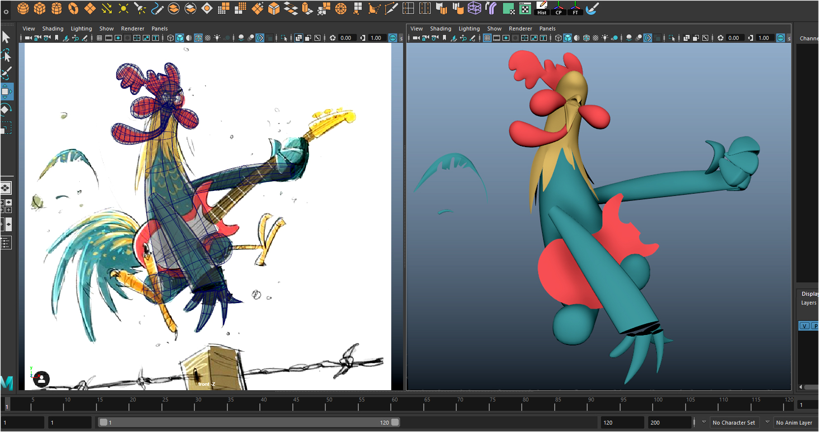 For the claws, I tried to translate the drawing’s flaws into 3D. If you look closely at the drawing, some claws are attached, some not, some are black and some are white or yellow; this is one thing I learned at AnimSchool: not to be afraid to reproduce the concept’s flaws.