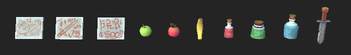 I wanted to make a marketplace scene, so there I knew there would be a lot of objects lying about. To create the effect of a bunch of items being strewn about everywhere, I created various props that could be added to the scene. Here are all the props used in the scene placed separately. This is so that you can just click on them and duplicate them on the spot, placing them wherever you feel like there should be an extra prop, or if there is an empty space that should be filled in.