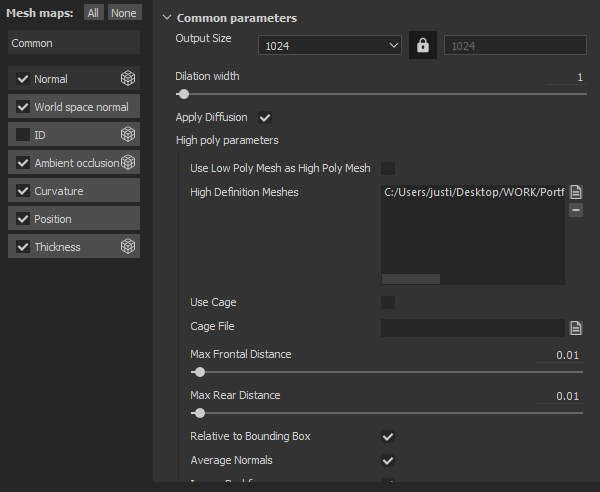 Usually, I start by baking the high poly meshes into the low poly meshes in Substance Painter. If I don’t have any high poly meshes, I just bake the low poly mesh to get the maps because I use a lot of settings that rely on those maps.