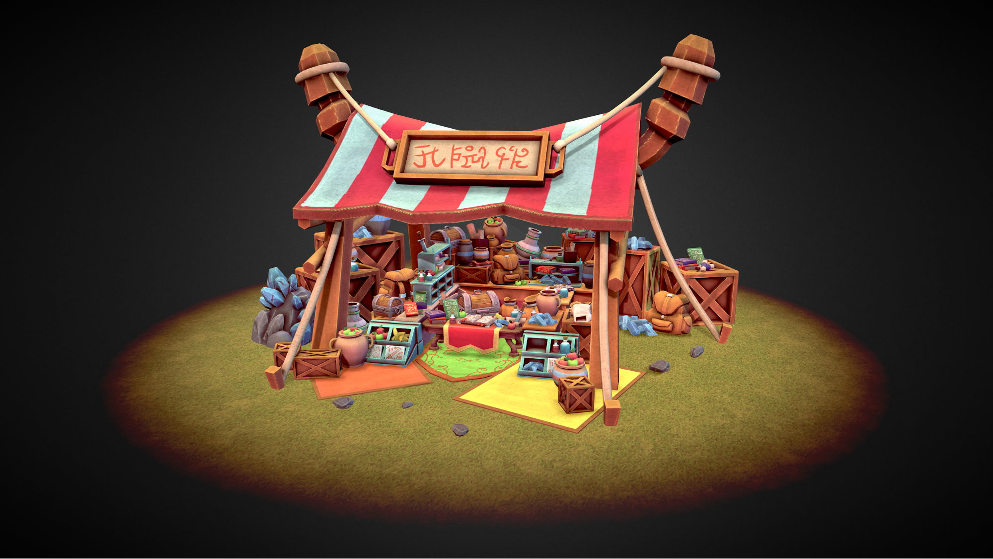 The tent was made as its own object as I was still trying to experiment with its shapes and silhouette. I wanted to create a recognizable silhouette as it creates a good foundation for an environment. One variation that I came up with was this anchor-like shape that looked interesting to me. However, I felt that it kind of took over the whole scene as it overwhelms the smaller objects that I would be placing under the tent. So I opted for a horned look and added a sign at the front of the tent because it looked kind of empty there.