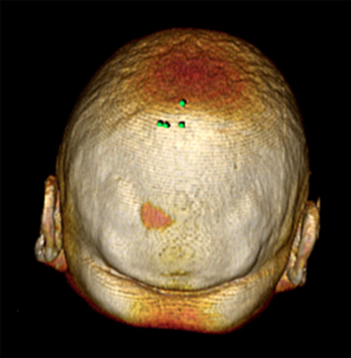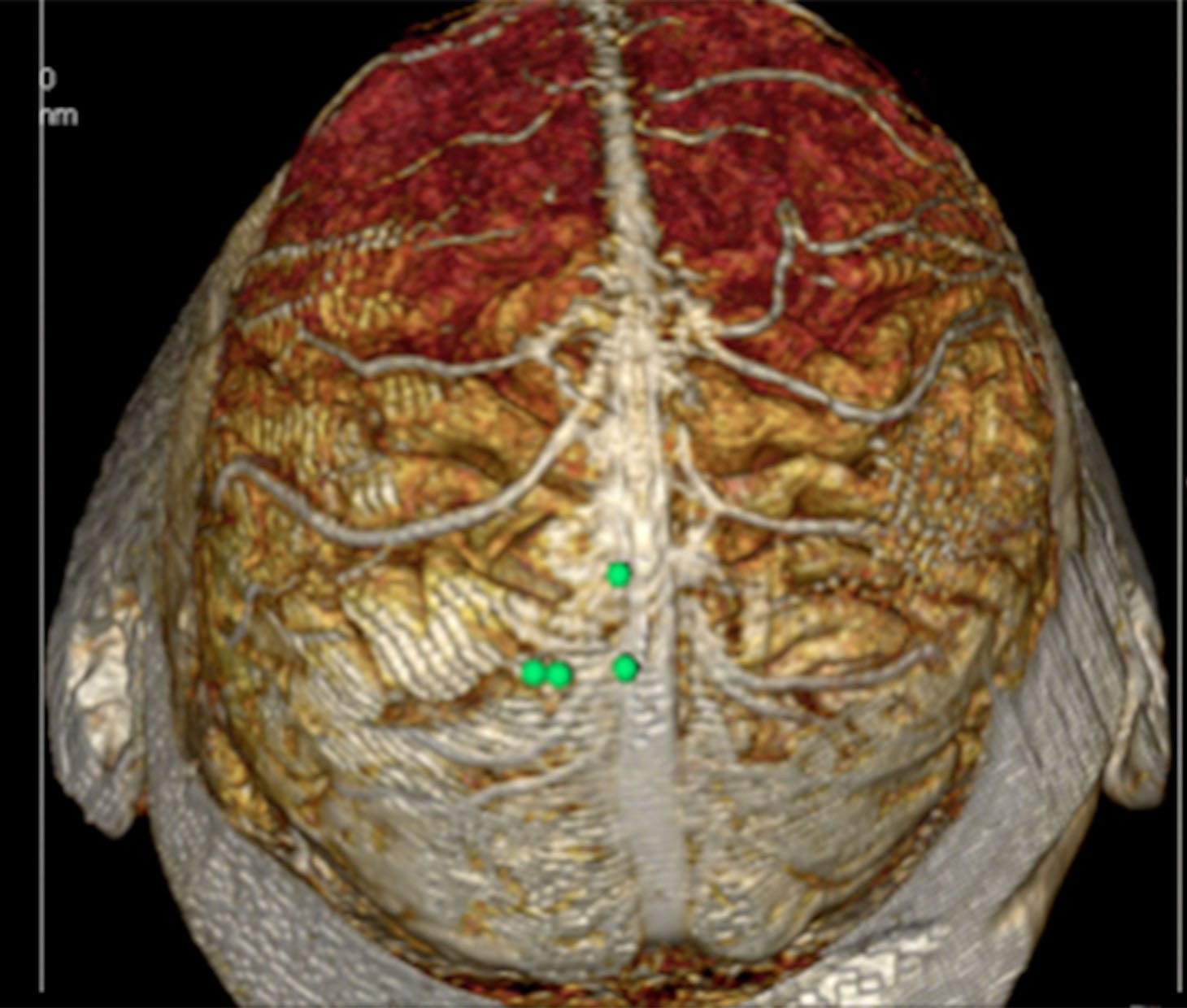 Figure 1. Example of preoperative planning in brain tumor surgery on Horos Software (Horos ProjectTM) based on contrast enhanced preoperative magnetic resonance imaging– A) localization of the projection pathological process over the scalp marked with green dots. B) Skull stripping technique leaving the brain exposed and superficial venous vessels. C) Simulation of the skin incision and craniotomy
